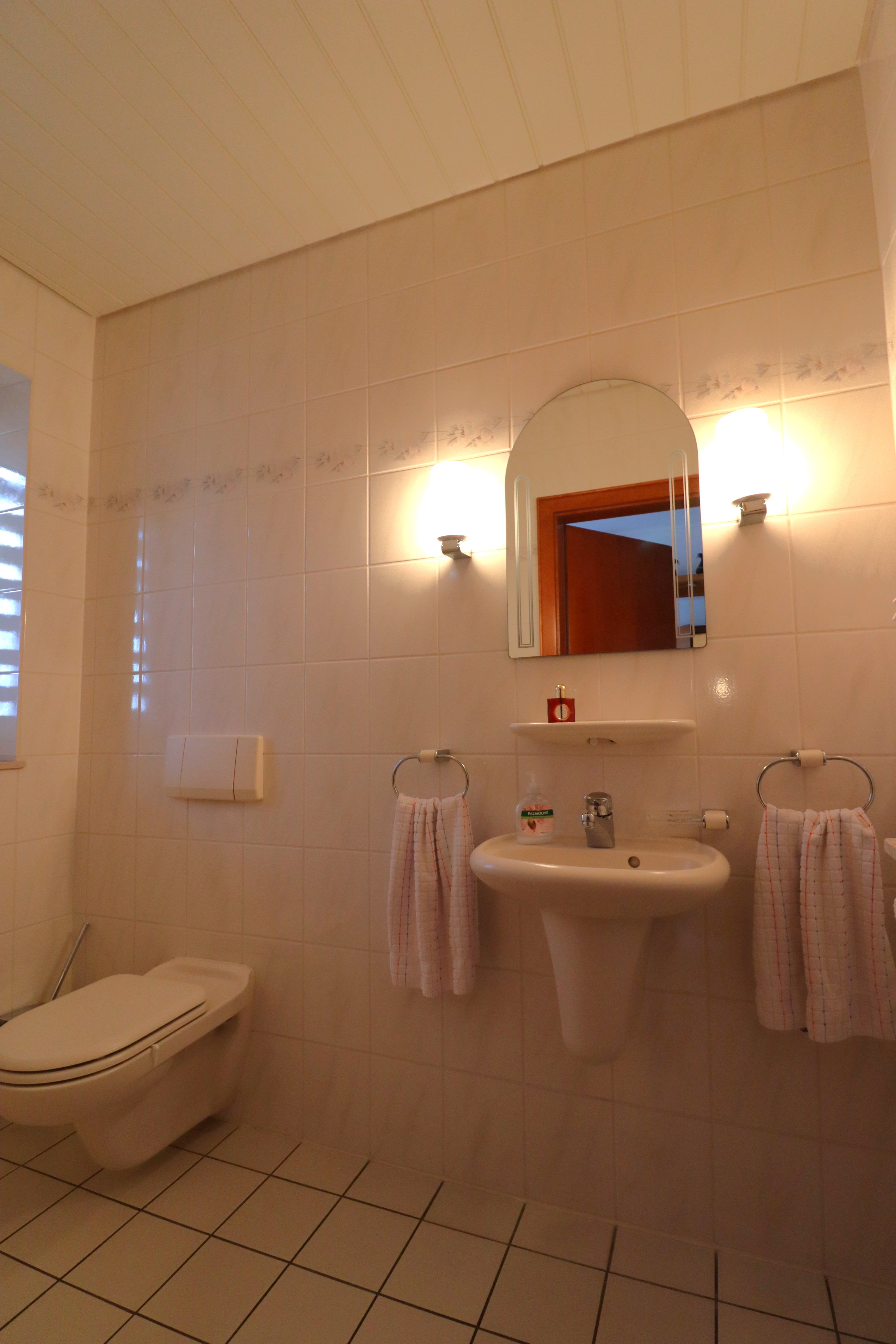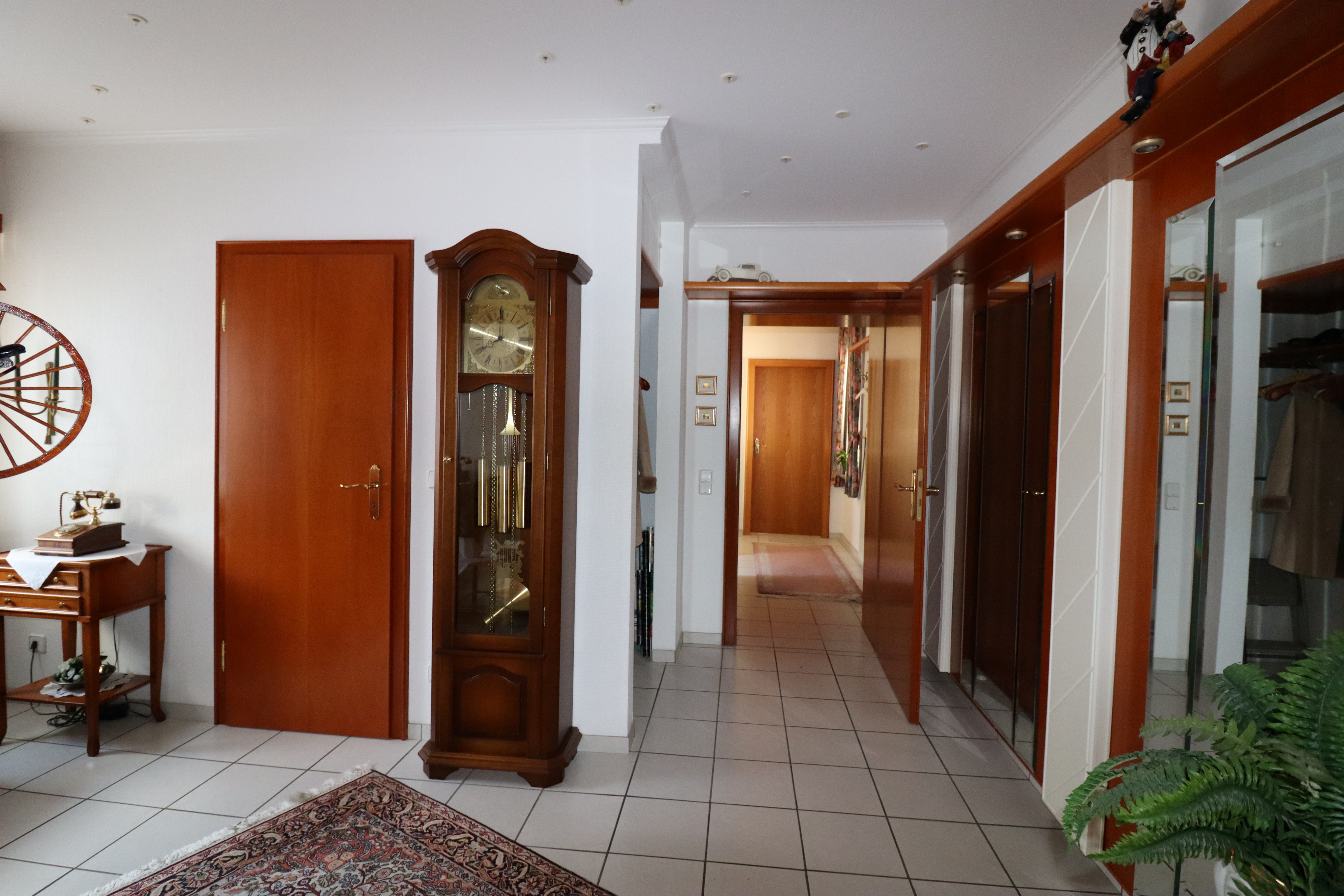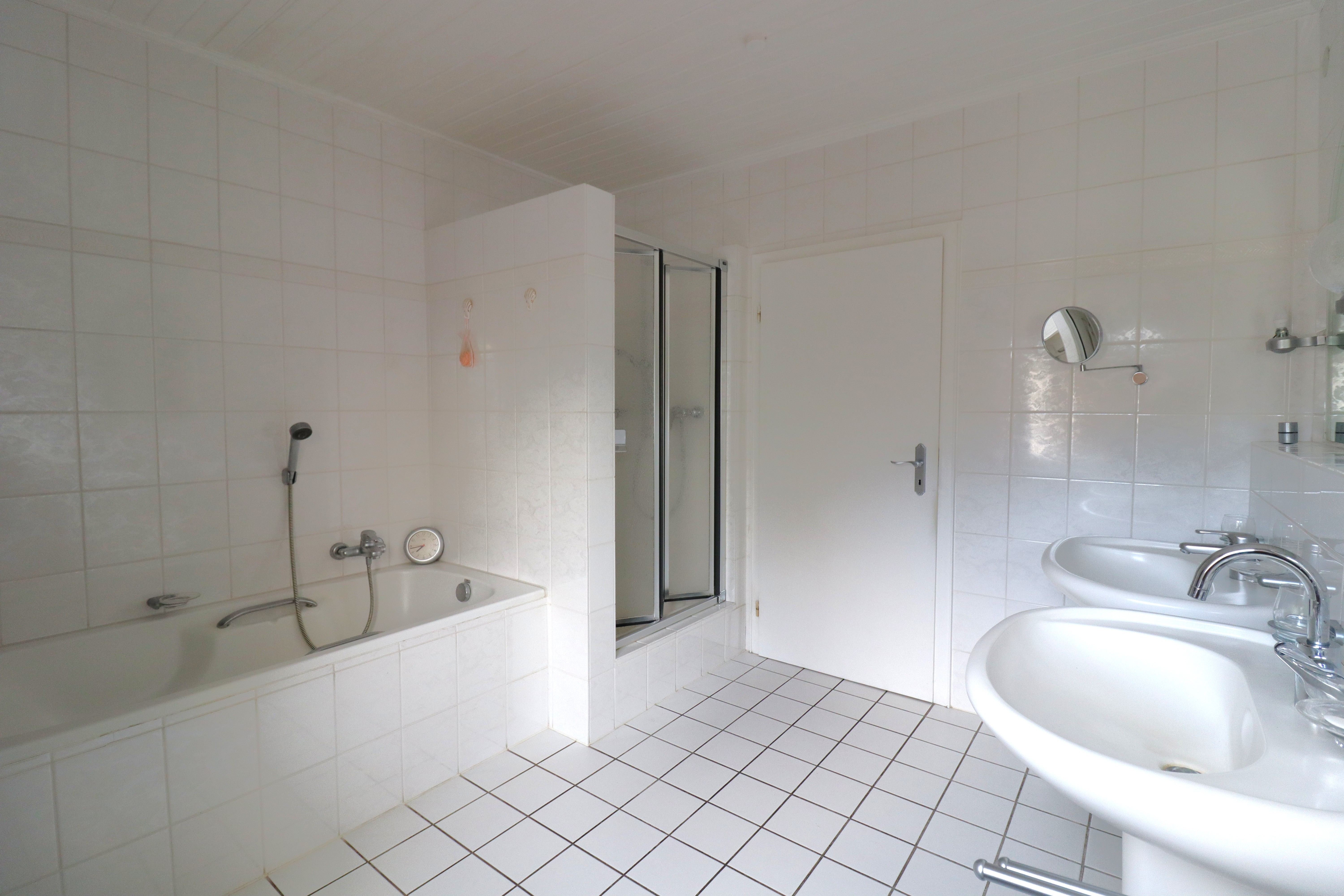 Der einladende Flurbereich bietet Zugang zum Gäste-WC und dem Flur zum Schlaf- und Badezimmer. Das großzügige helle und gepflegte Badezimmer verfügt über ein Fenster, zwei Waschbecken, Badewanne und Dusche.