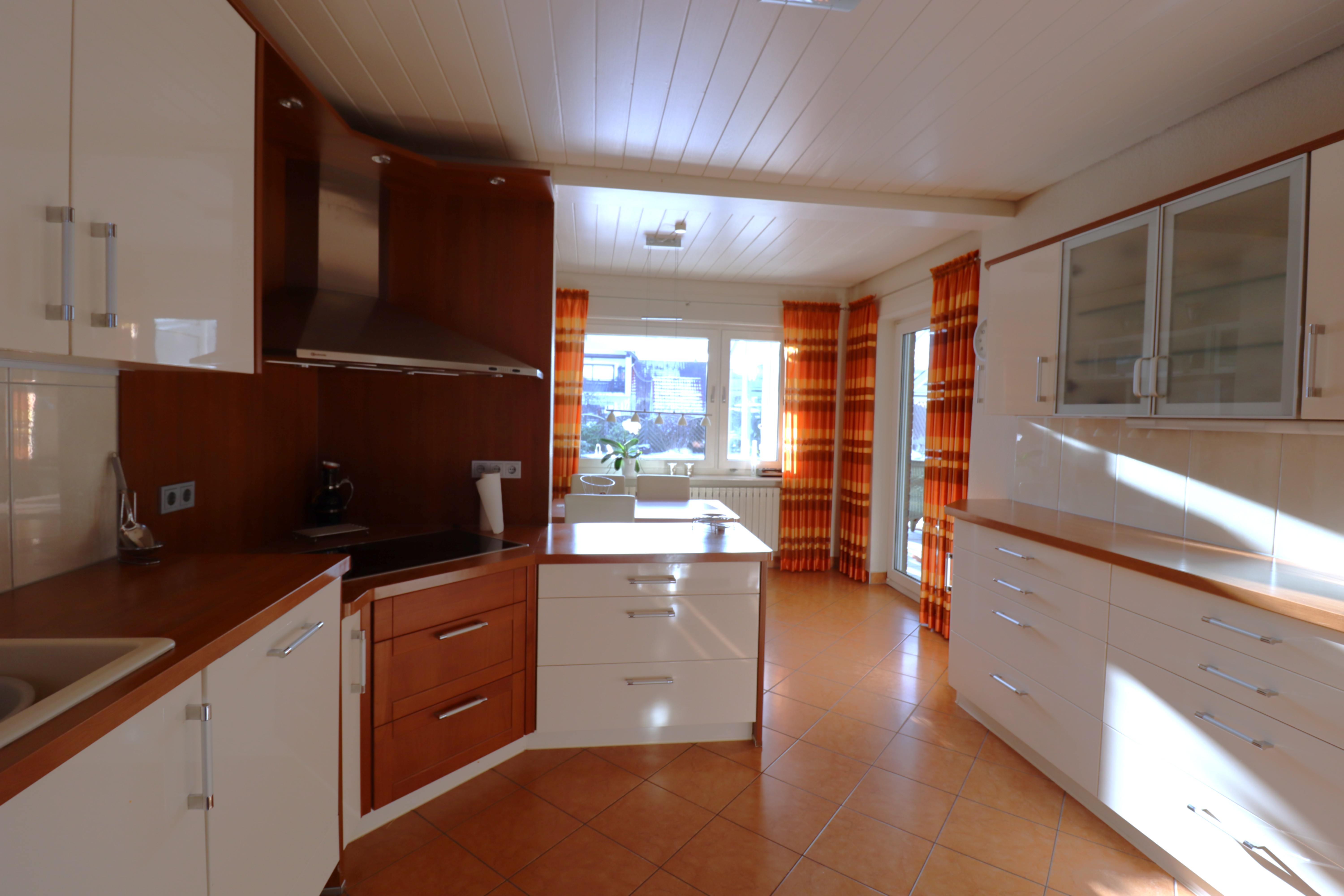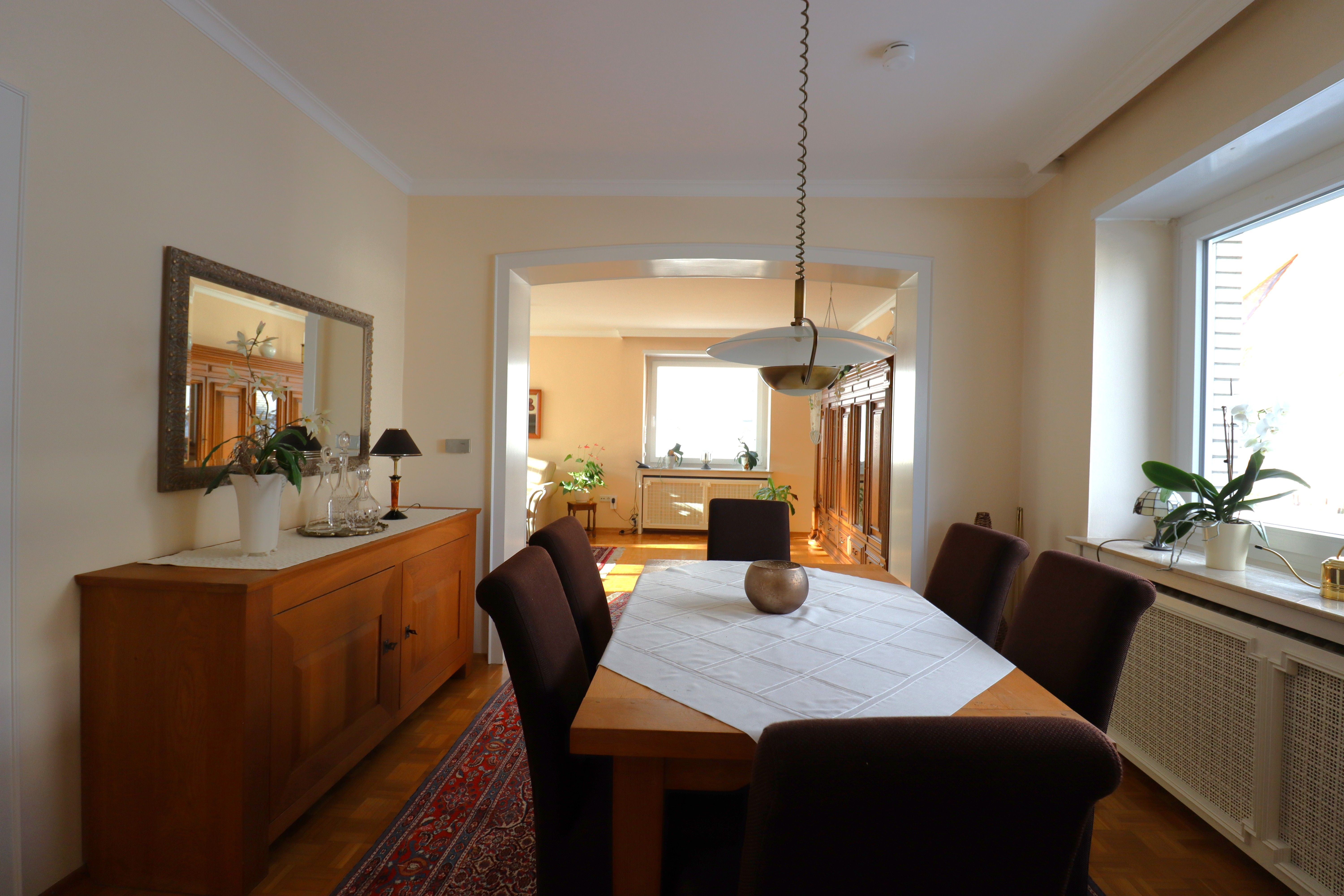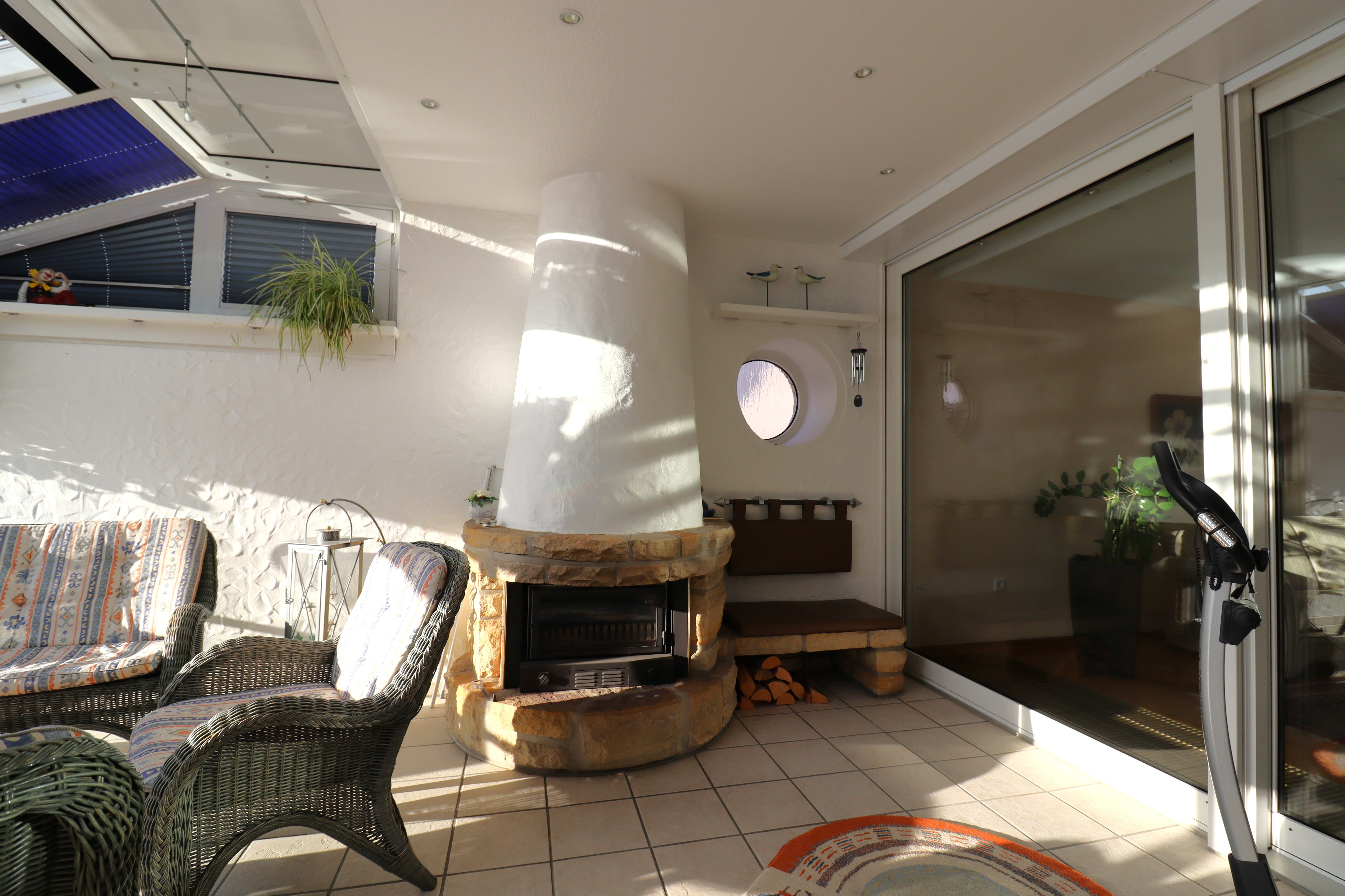 Der Wintergarten mit Kamin und Außenzugang zum wunderschönen Garten ist ein echter Wohlfühlplatz. Der Wohnbereich ist großzügig und geschmackvoll mit dem sehr gepflegten Echtholzparkett und dem angrenzenden Esszimmer. Die Küche ist mit einer sehr schönen Einbauküche ausgestattet, die den Mietern zur Nutzung unentgeltlich überlassen werden kann. Auch hier ist ausreichend Platz für einen Essbereich. Die Räume sind, durch ausreichend neuwertige Fenster, alle sehr gut belichtet.